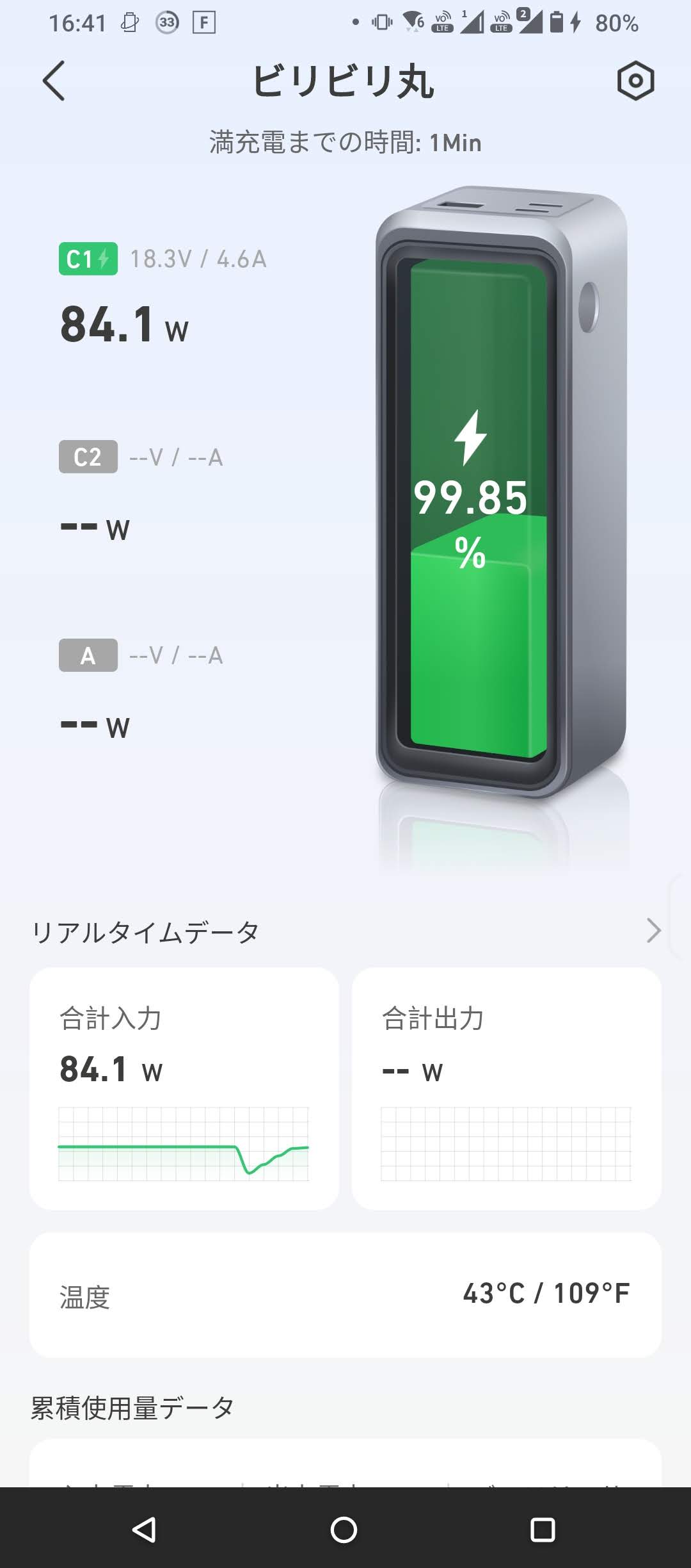 バッテリー残量はともかく、入出力のW(ワット)や電流・電圧が分かったところでユーザーがどうこうできるわけではありませんが、急速充電されていないことに気付けたり3、何より見ていて楽しいです。 また、あと何分くらいバッテリーが持つのか、あるいは(本機を充電している際には)何分くらいで100%まで充電されるかも分かります。
